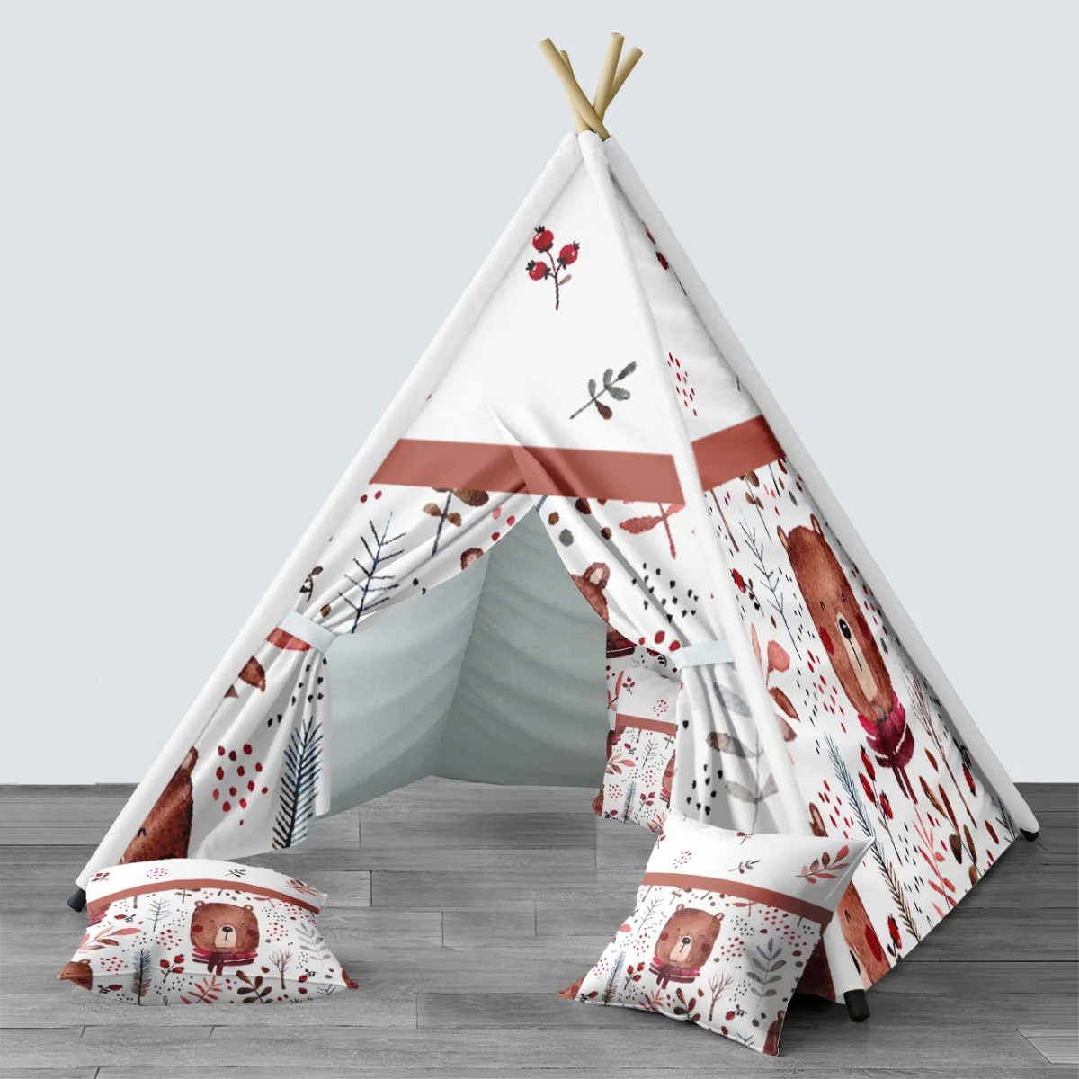 Orman Hayvanları temalı Çadır Evi. Beyaz baskılı. Bebek odası için özel tasarım.