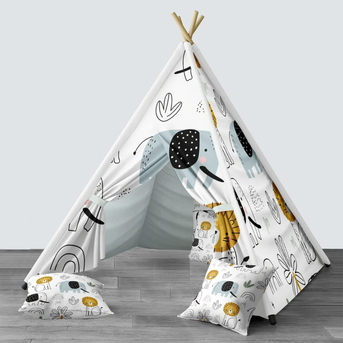 Orman Hayvanları temalı Çadır Evi. Beyaz baskılı. Bebek odası için özel tasarım.