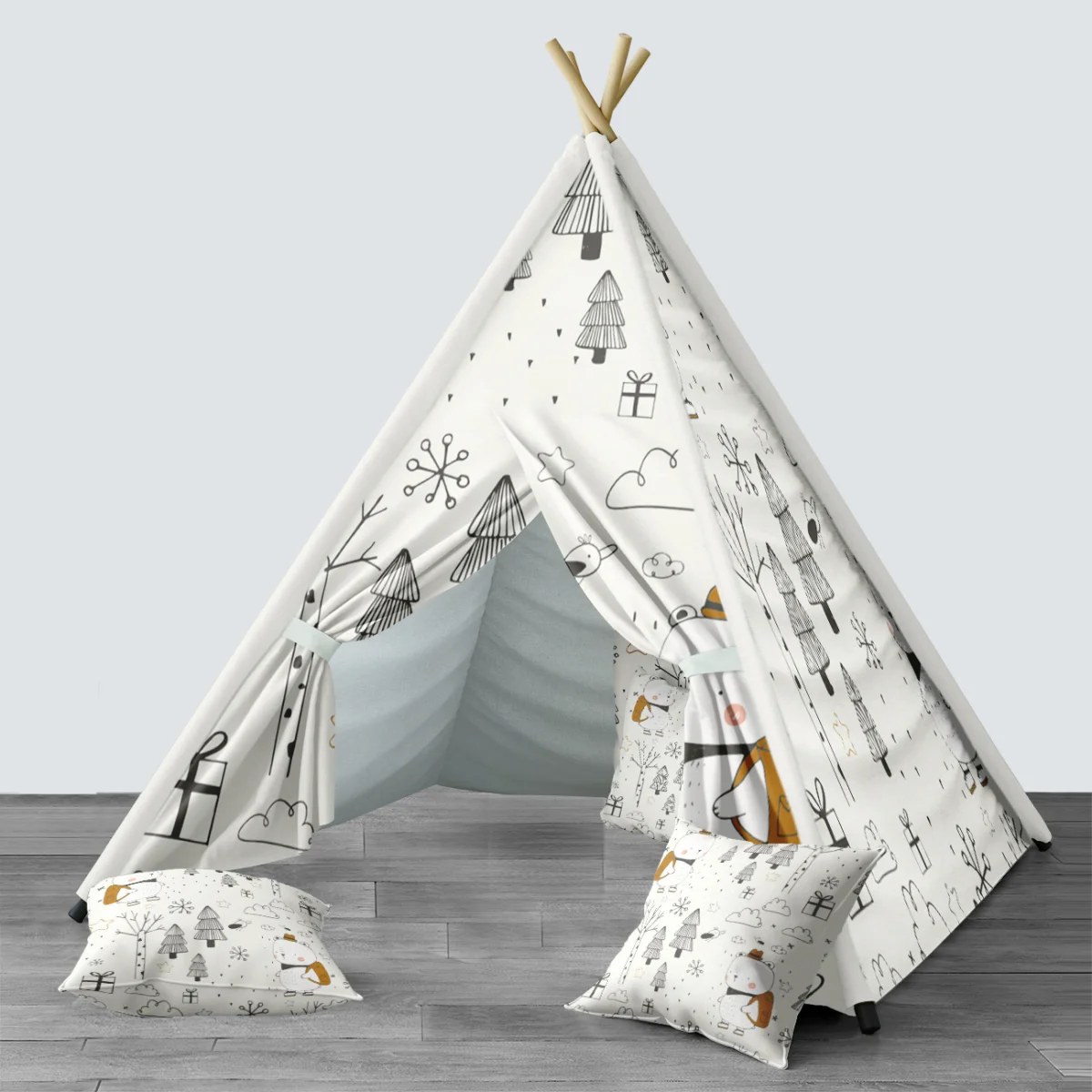 Orman Hayvanları temalı Çadır Evi. Beyaz baskılı. Bebek odası için özel tasarım.