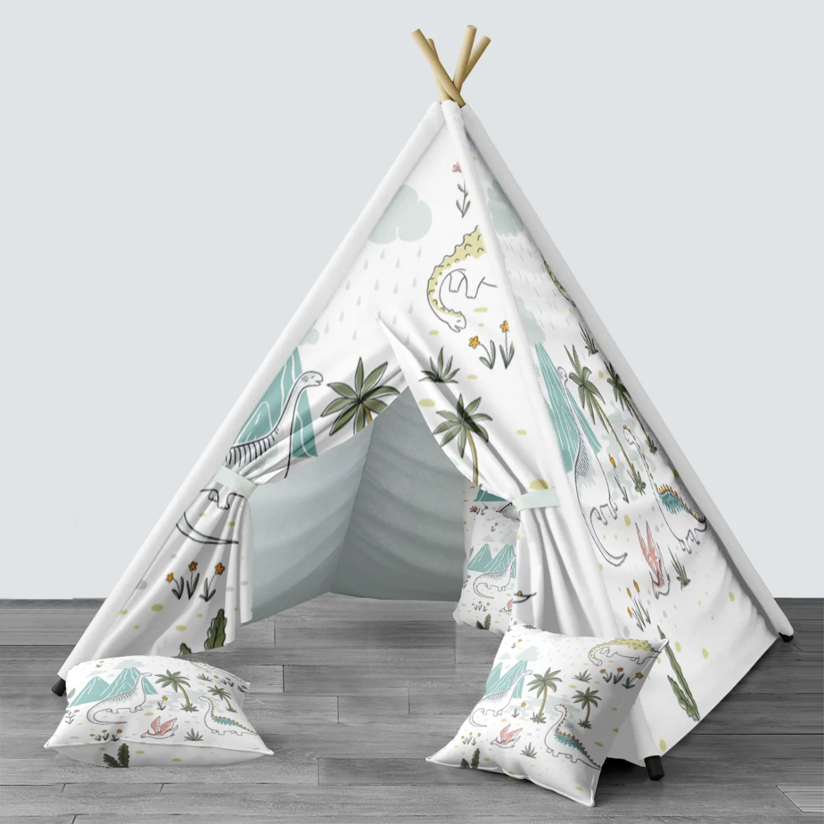 Dinozorlar temalı Çadır Evi. Beyaz baskılı. Bebek odası için özel tasarım.