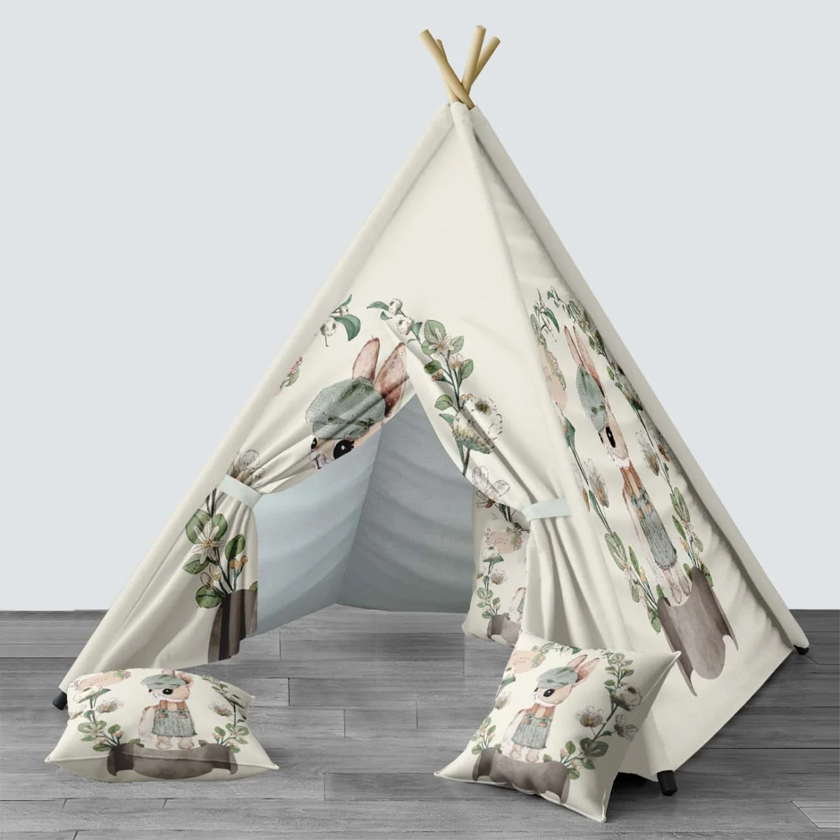 Tavşan temalı Çadır Evi. Krem baskılı. Bebek odası için özel tasarım.