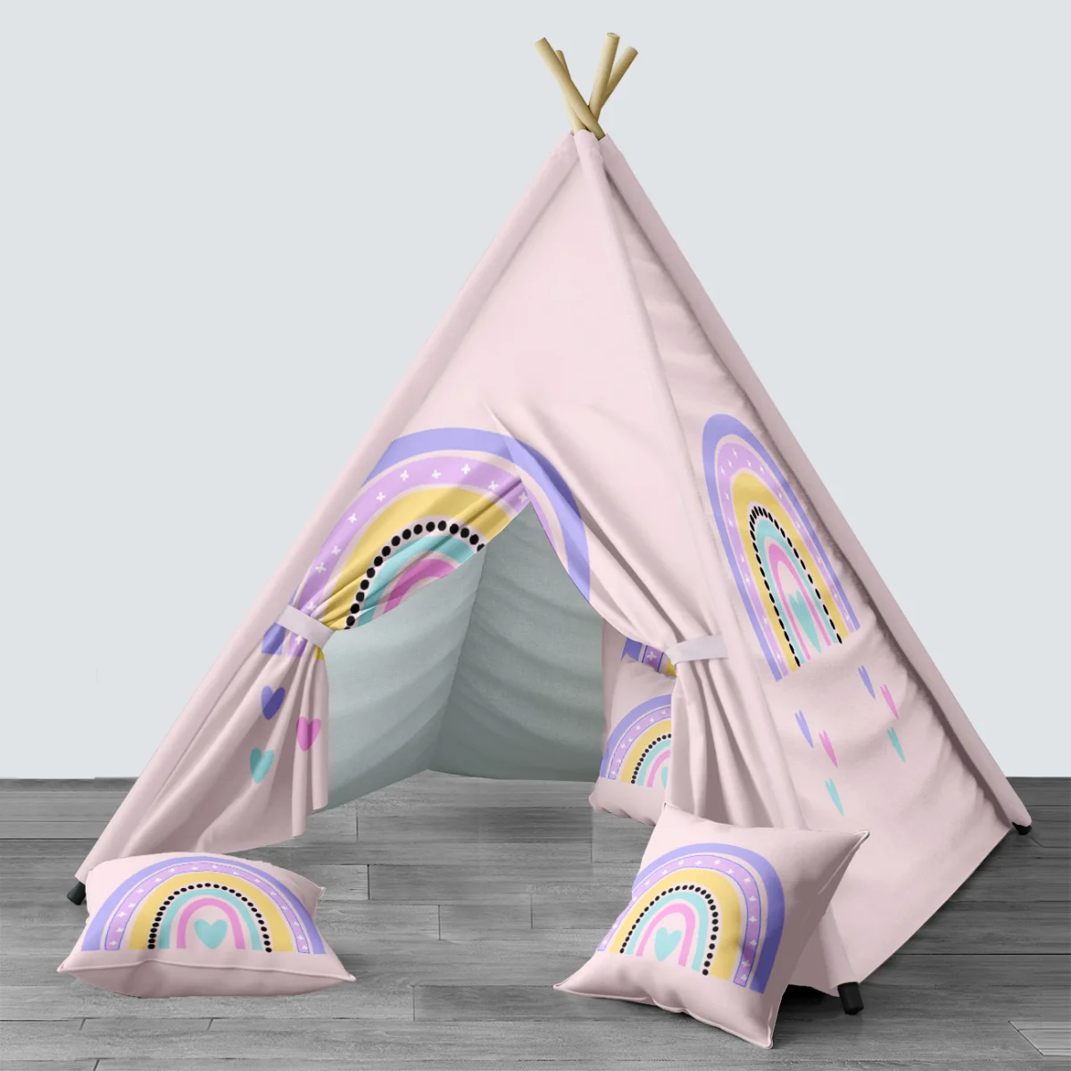 Gökkuşağı temalı Çadır Evi. Pembe baskılı. Kız bebek odası için özel tasarım.