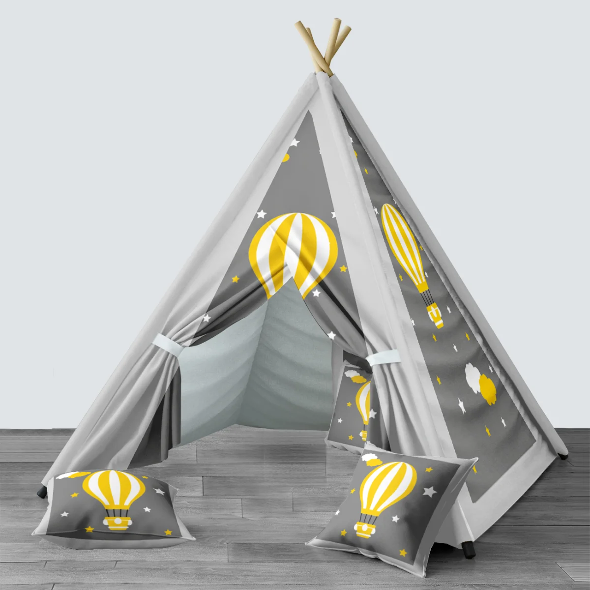 Sıcak hava balonu temalı Çadır Evi. Gri baskılı. Bebek odası için özel tasarım.