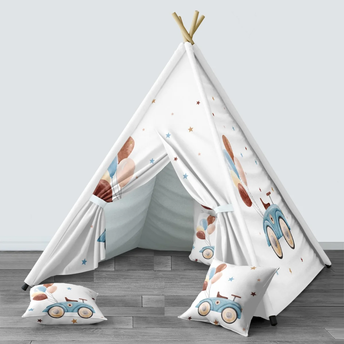 Oyuncak Araba temalı Çadır Evi. Beyaz baskılı. Bebek odası için özel tasarım.